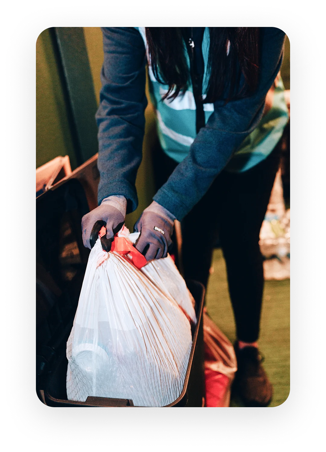 - Securely tie all bags to prevent spills