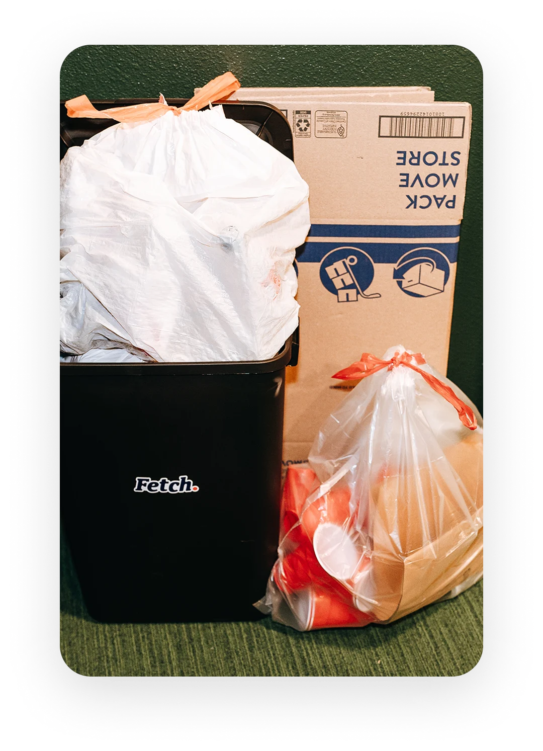 - Place your trash inside your bin and flattened boxes behind the bin